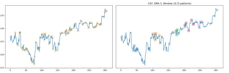 As you can see, we are getting more patterns than we need. Our params (smoothing and window range) are too sensitive for this timeframe (60 minutes).